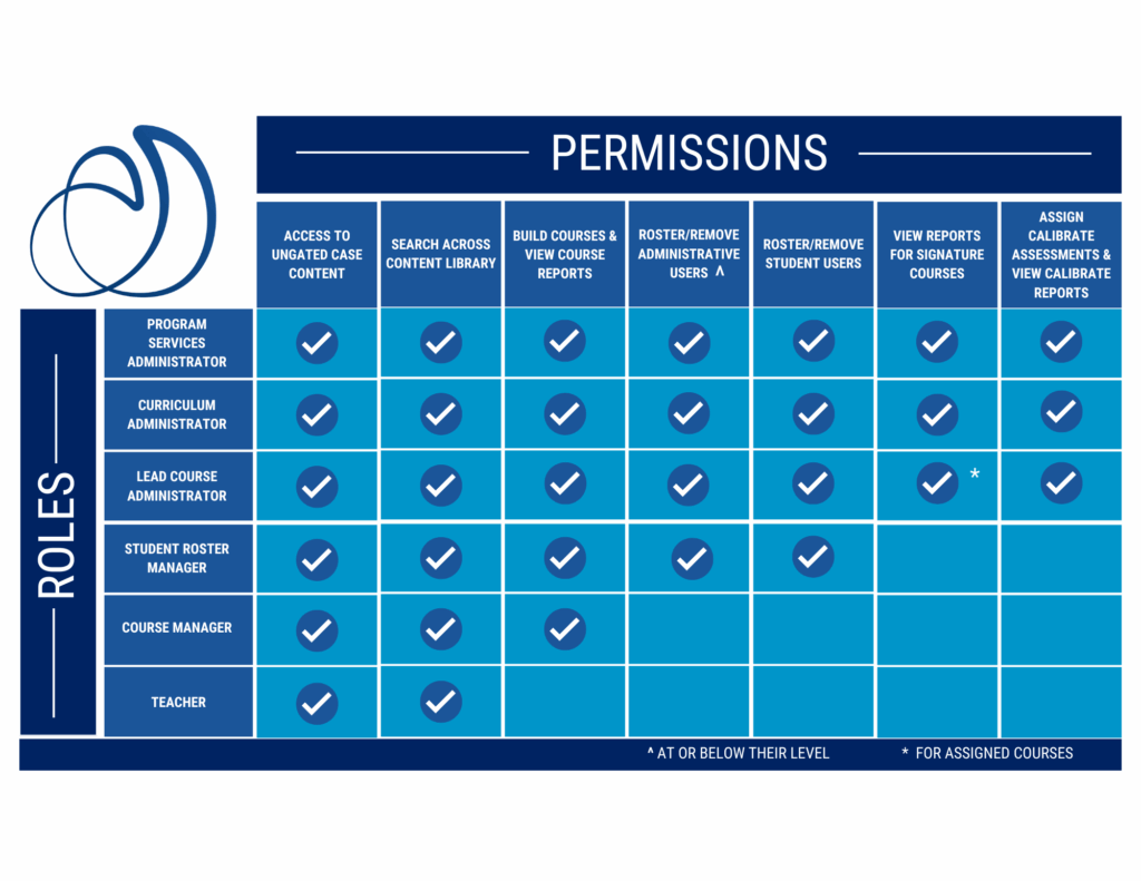 - Are at the highest level in the permission hierarchy—the Program Service Administrator can perform any role within the system as fits your program, including building courses, viewing student cases, adding/deleting other educators, and performing any other role