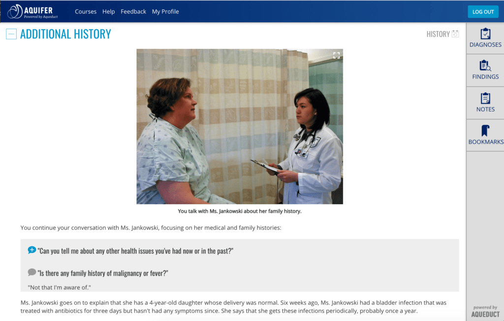Aquifer cases walk students through all of the steps of a patient encounter.